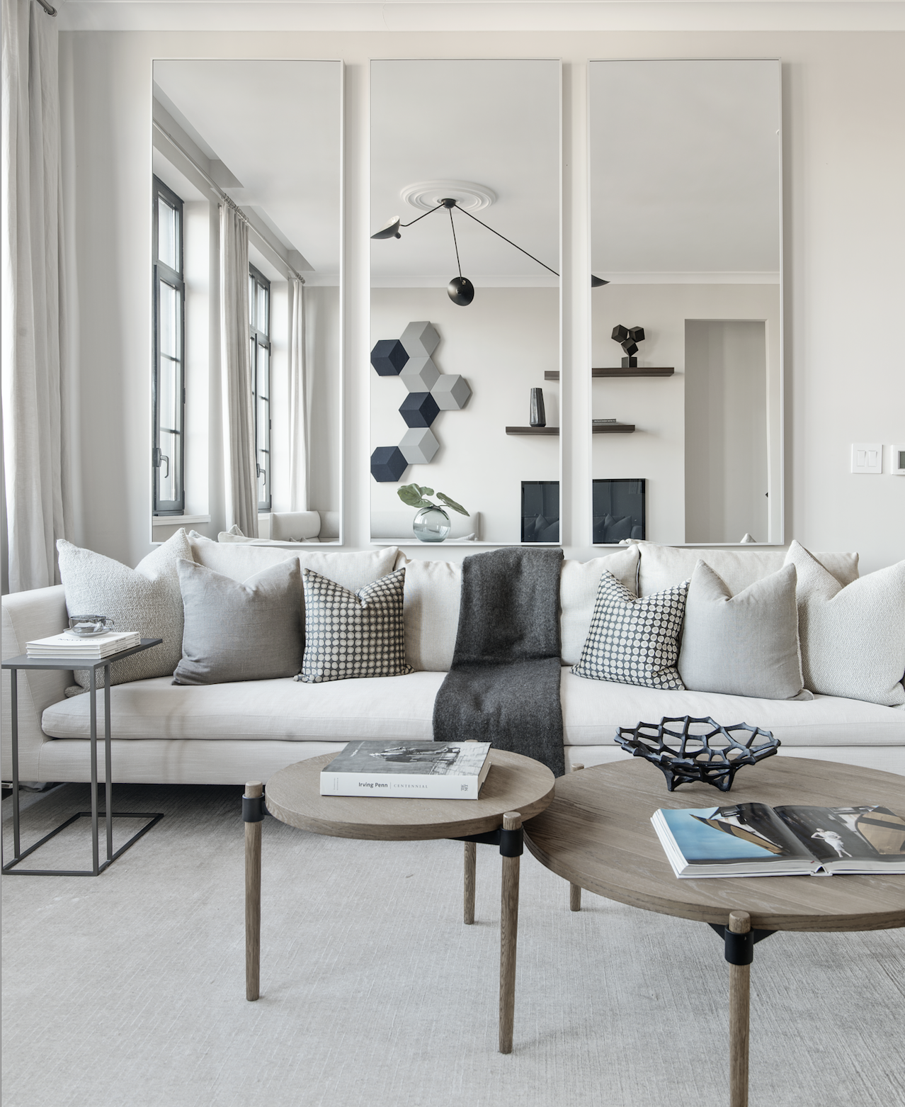 La iluminación es esencial, mientras más luz tenga tu sala más amplia se verá, sino es posible conseguir luz natural puedes iluminar centralmente el espacio y apoyar a las esquinas con lámparas de piso que además están en tendencia.